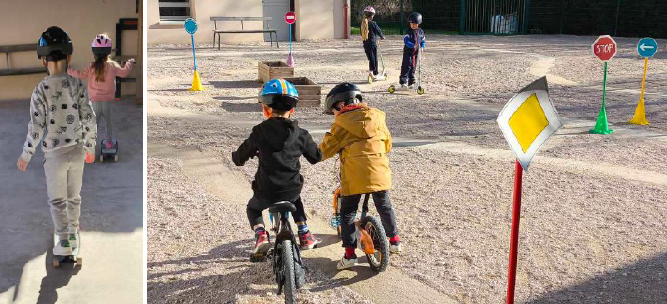 - trottinette: aller tout droite, poser parfois son deuxième pied sur la trottinette, suivre un parcours (tourner, slalomer, passer entre deux bandes, passer sous une porte…), s’arrêter au bon endroit, suivre des panneaux de signalisation