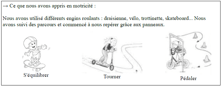 - vélo (roulettes interdites): commencer par s’équilibrer avec une draisienne ou un vélo sans pédale, pédaler avec l’aide d’un adulte qui suit le vélo et lâche petit à petit l’élève, pédaler en ligne droite seul, suivre un virage, suivre un parcours (comme en trottinette)