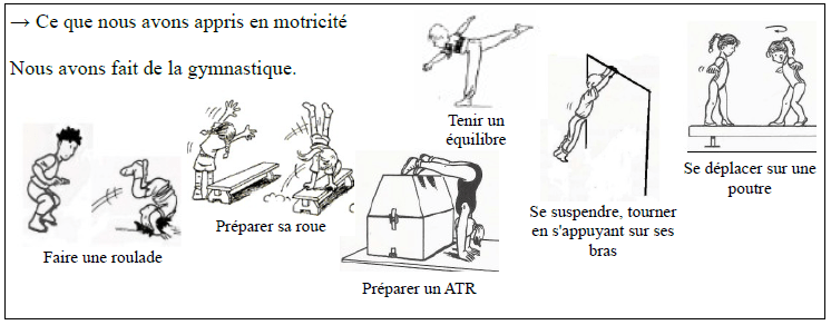 - Gymnastique au sol: tenir un équilibre quelques secondes (sur un pied, faire la planche, charrue, chandelle, araignée, pont), faire une roulade avant (depuis un plan incliné, avec aide, depuis une plateforme, sans aide, dans un cerceau, depuis le trampoline), faire une roulade arrière (faire le culbuto, utiliser un plan incliné), faire une roue (par dessus un banc, définir des zones pour les mains et les pieds), préparer un ATR (poser ses mains par terre et ses jambes sur un support, se déplacer, partir d’une plateforme…)